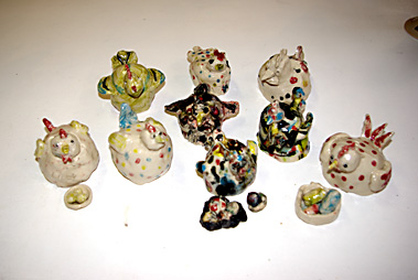 Diese Katzen und Hühner haben Kinder bei einem Kindergeburtstag in meiner Werkstatt modelliert und anschließend mit Engoben und Pinseln bemalt. Wir hatten großen Spaß beim Töpfern. |