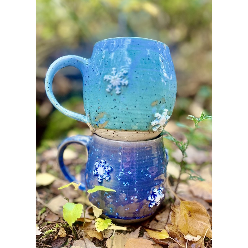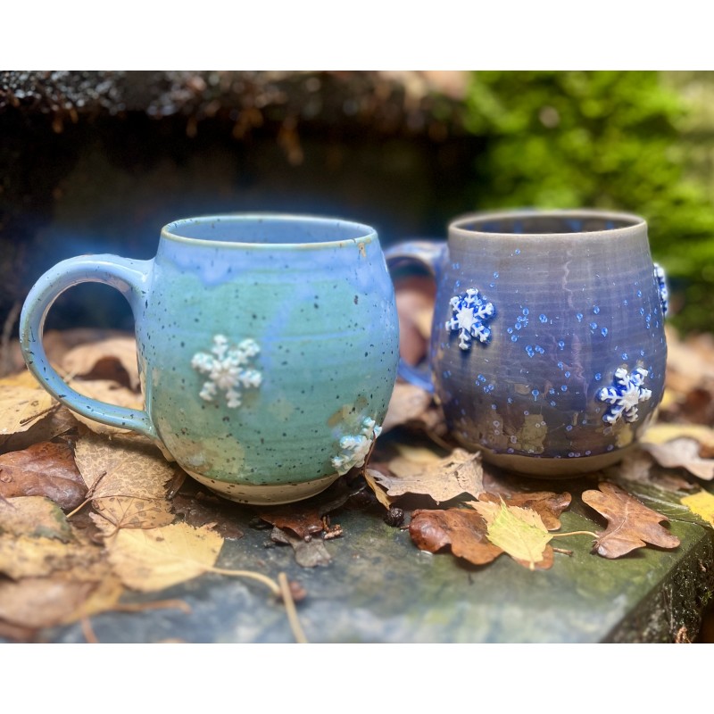 weiße Schneeflocken mit hellblauen Kristsllen.